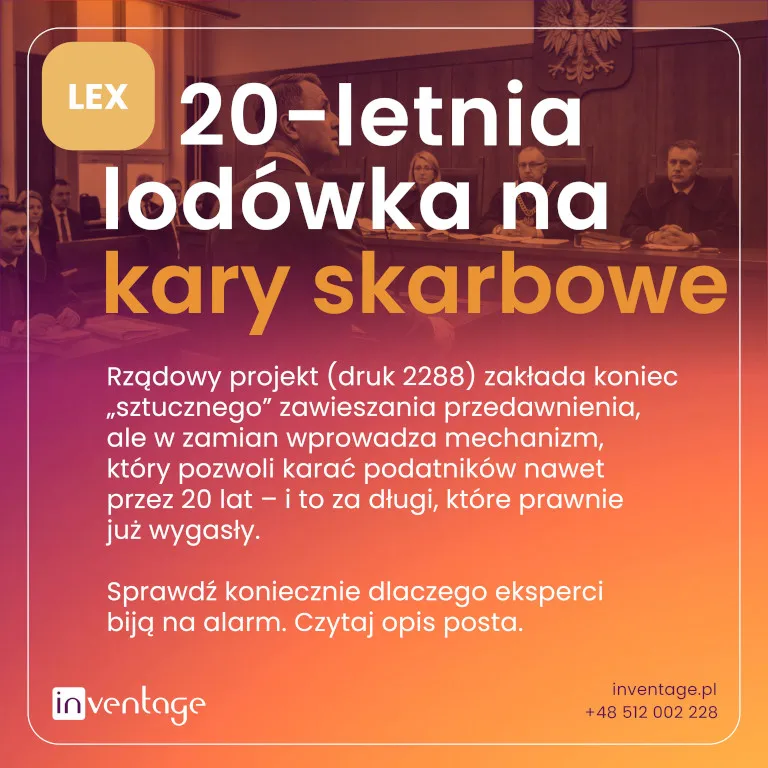 ✔️ 20 lat w niepewności i rewolucja w dokumentach: Termin karalności zostanie odcięty od przedawnienia podatku. Fiskus zyska aż dwie dekady na postawienie Cię przed sądem. To zmienia wszystko: choć prawo nakazuje trzymać dokumenty przez 5 lat, w nowej rzeczywistości ich zniszczenie po tym terminie będzie skrajnym ryzykiem. Aby mieć jakąkolwiek szansę na obronę przed sądem po 15 latach, przedsiębiorcy będą zmuszeni archiwizować dokumentację przez 20 lat. Bez nich obrona przed prokuratorem będzie czystą iluzją.